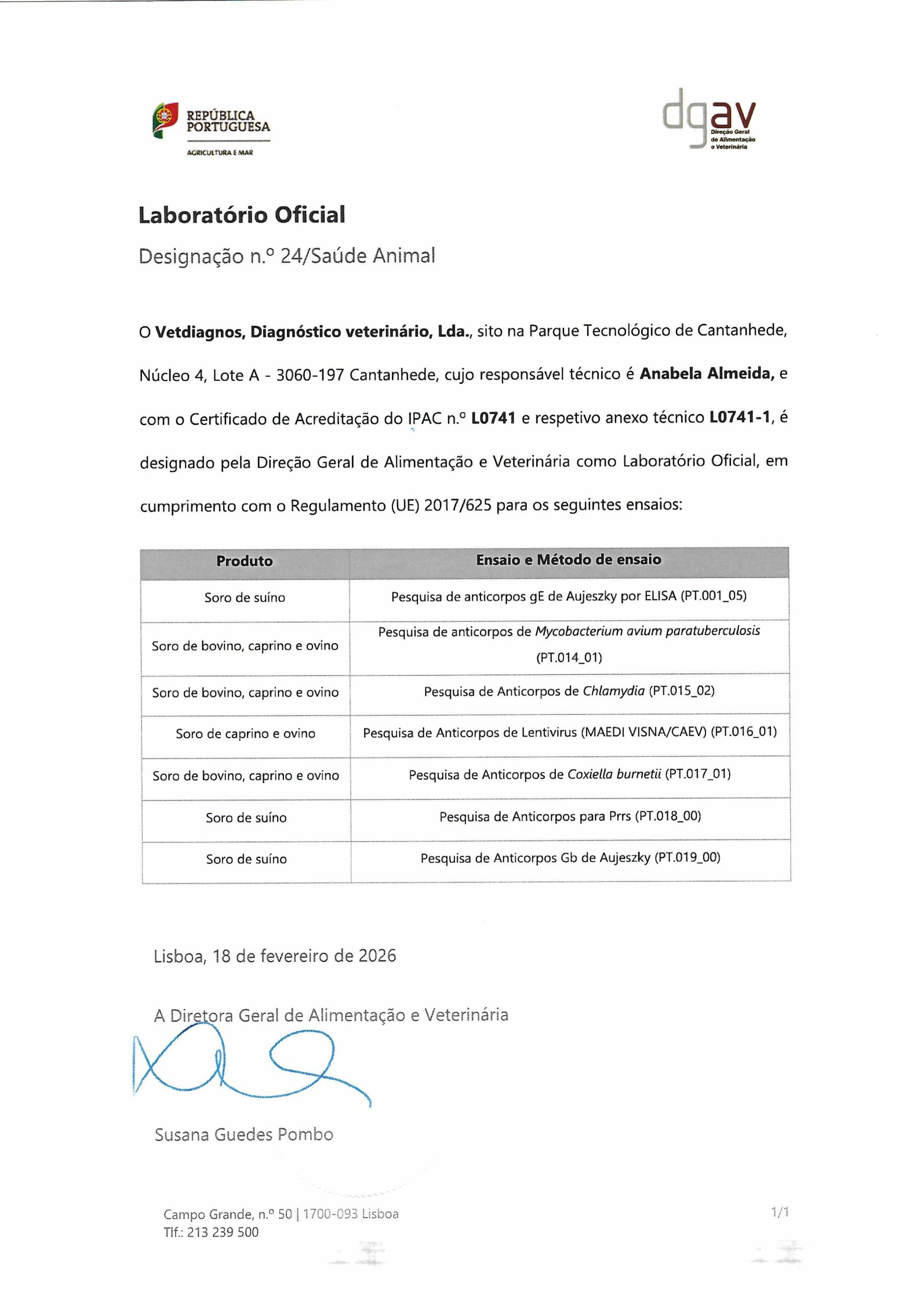 Laboratório Oficial, reconhecimento n.º 24/Saúde Animal, designado pela Direção Geral de Alimentação e Veterinária – DGAV.